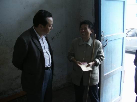 26日上午,唐理事長一行首先來到雙河鎮(zhèn)瑪瑙村視力殘疾王正碧家中,陪同的鎮(zhèn)長徐波簡單介紹了王正碧的家庭情況,王正碧由于視網膜脫落造成雙目終生失明,先后治療花費10多萬元,家庭經濟十分困難,鎮(zhèn)上已經把她納入農村低保家庭享受對象,今年又納入了“陽光家園計劃”居家托養(yǎng)項目。唐理事長拉著王正碧的手說:“王姐,馬上就是國慶了,我代表縣委政府、縣殘聯(lián)看望你,你現在家庭有困難了,鎮(zhèn)黨委政府也非常關心,我相信有各級政府的關心和全社會的關注,我們殘疾人的生產生活狀況是會不斷改善的!辈⑺腿ノ繂柦200元。隨后,唐理事長一行又驅車前往交通村看望慰問肢體殘疾人王浩,當唐理事長了解到王浩由于車禍造成下肢癱瘓,家中還欠下外債4萬多元,妻子常年服侍不離不棄,家庭沒有其他收入來源,生活還很困難時,唐理事長動情的說:“殘疾人和殘疾家庭是我們這個社會的弱勢群體,各級政府的關心固然很重要,更重要的是殘疾人自己要有信心,殘疾家庭要有關心和愛心,夫妻更要有患難與共的真心,只有這樣,再大的困難也能克服!