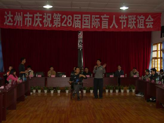 10月13日下午,為慶祝第28屆國(guó)際盲人節(jié),由市殘聯(lián)主辦,市盲人協(xié)會(huì)、通川區(qū)殘聯(lián)、達(dá)縣殘聯(lián)協(xié)辦的“達(dá)州市慶祝第28屆國(guó)際盲人節(jié)聯(lián)誼會(huì)”在市四通職業(yè)技術(shù)培訓(xùn)學(xué)校成功舉辦。市殘聯(lián)黨組成員、機(jī)關(guān)黨委書(shū)記楊文平,副調(diào)研員劉慶福,省盲協(xié)委員劉建華,市盲人協(xié)會(huì)主席姜華鍔,通川區(qū)殘聯(lián)副理事長(zhǎng)熊權(quán)先,達(dá)縣殘聯(lián)辦公室副主任張淑彬等出席了慶;顒(dòng)。通川區(qū)、達(dá)縣城區(qū)部分盲人代表和2011年全市盲人保健按摩職業(yè)技能(中級(jí))培訓(xùn)班的全體學(xué)員約80人參加了聯(lián)誼活動(dòng)。
