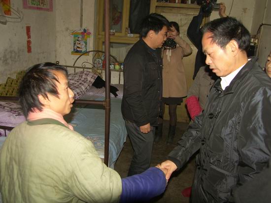 廖小云一行來(lái)到川煤六處肢體殘疾人李永志家中,與李永志及其家人促膝談心。當(dāng)了解到李永志今年54歲,一家三口人擁擠地住在40多平米的簡(jiǎn)易房?jī)?nèi),父母年老體弱,長(zhǎng)期服藥,家庭非常困難的情況后。廖小云向他們一家表示親切的問(wèn)候,鼓勵(lì)他們保持樂(lè)觀向上的精神狀態(tài),克服殘疾帶來(lái)的困難,樹(shù)立起生活的信心,努力開(kāi)創(chuàng)美好幸福生活。在重度精神殘疾人陽(yáng)輝家中,廖小云詳細(xì)了解陽(yáng)輝一家的基本生活情況和身體狀況。廖小云說(shuō),黨和政府非常關(guān)心殘疾人的生活,這些年我市相繼出臺(tái)了一系列扶殘助殘的優(yōu)惠政策,也采取了積極的救助措施,但仍有一部分貧困殘疾人生活比較困難,這需要全社會(huì)的共同關(guān)心,努力營(yíng)造尊重、理解、關(guān)心、幫助殘疾人的良好社會(huì)氛圍。在肢體殘疾人秦幫瓊家中,得知秦幫瓊一家三口借住在哥哥家中,丈夫無(wú)業(yè),兒子正在上中學(xué),全家人僅靠400多元的低保收入維持生活的情況后,廖小云叮囑川煤六處的領(lǐng)導(dǎo)要多關(guān)心這些困難殘疾人,認(rèn)真解決好他們的生活困難。隨后,廖小云把200元慰問(wèn)金送到秦幫瓊手中,祝他們?nèi)疫^(guò)一個(gè)歡樂(lè)喜慶的春節(jié),也祝愿他們?nèi)疑钤絹?lái)越好。秦幫瓊深受感動(dòng),她緊緊握住廖小云的手,激動(dòng)地說(shuō):“感謝黨和政府,感謝殘聯(lián)的關(guān)心,殘聯(lián)和川煤六處的領(lǐng)導(dǎo)在春節(jié)前來(lái)看望我,覺(jué)得很溫暖”。