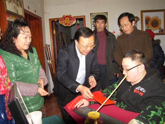 2012年1月19日,達(dá)城處處張燈結(jié)彩,年味正濃。市委副書記、市長何健在達(dá)州軍分區(qū)司令員劉璞、市人大常委會(huì)副主任劉元成、市政協(xié)副主席劉方棠、市政府秘書長張禮宗及市政府辦公室、市委組織部、市民政局、市殘聯(lián)等部門負(fù)責(zé)人的陪同下,帶上禮品和慰問金,走進(jìn)達(dá)縣南外鎮(zhèn)云內(nèi)動(dòng)力華川汽車有限公司生活區(qū)貧困殘疾人陳柏男家中,與他們拉家常、聊生活,送上市委、市政府的溫暖。