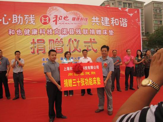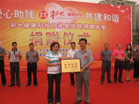 在捐贈儀式上,渠縣人民政府副縣長、渠縣人民政府殘疾人工作委員會主席呂蕓同志為上海和也公司的慈善之舉授予并贈送“助殘扶弱、愛心無限”的愛心牌匾。參會領(lǐng)導(dǎo)并將捐贈的健康床墊現(xiàn)場為殘疾人贈送,殘疾人代表也作了感謝發(fā)言。