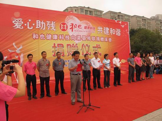 儀式上,中共渠縣縣委常委、總工會主席李佳林做了重要講話,并強(qiáng)調(diào):此次上海和也公司通過義捐行動回饋社會,表達(dá)了對弱勢困難群體的關(guān)愛之情,充分體現(xiàn)了該公司熱心社會慈善事業(yè)、樂善好施的中華民族傳統(tǒng)美德。渠縣是一個有10.88萬的殘疾人口大縣,需要關(guān)注、關(guān)心、關(guān)愛、幫助的殘疾人較多,在此,呼吁社會各界仁人志士和更多企業(yè)伸出愛心之手,發(fā)揚(yáng)互助精神,扶弱濟(jì)貧、共建和諧社會。同時,和也有限公司董事長方志財先生做了講話,并現(xiàn)場向縣殘聯(lián)捐贈健康床墊30床,方志財強(qiáng)調(diào),渠縣是個人口大縣,又是殘疾人口大縣,又常年被洪水淹,需要幫助的殘疾人較多,今后,公司將繼續(xù)秉承 “和孝”文化的企業(yè)精神關(guān)心渠縣的殘疾人事業(yè)、幫助更多的殘疾人。