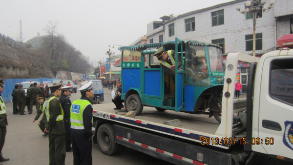 | 3月15日,按照萬源市委、市政府的工作要求,萬源市公安局積極配合交通運管、城管等部門,由交管大隊副大隊長蘇波帶隊,在萬源城區(qū)開展了整治殘疾人非法營運專項行動。