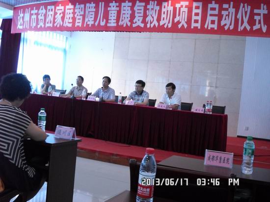2013年6月17日下午,達(dá)州市貧困家庭智障兒童康復(fù)救助項目啟動儀式在達(dá)州市腦癱(智障)兒童康復(fù)訓(xùn)練基地隆重舉行。市殘聯(lián)黨組書記、理事長廖小云、成都華康醫(yī)院院長洪廣出席活動并作講話,市殘聯(lián)黨組成員、副理事長楊文平主持了啟動儀式。成都華康醫(yī)院、達(dá)州市康復(fù)中心、各縣(市、區(qū))殘聯(lián)分管康復(fù)的負(fù)責(zé)同志、康復(fù)股長、康復(fù)骨干及受助患者代表參加了啟動儀式。