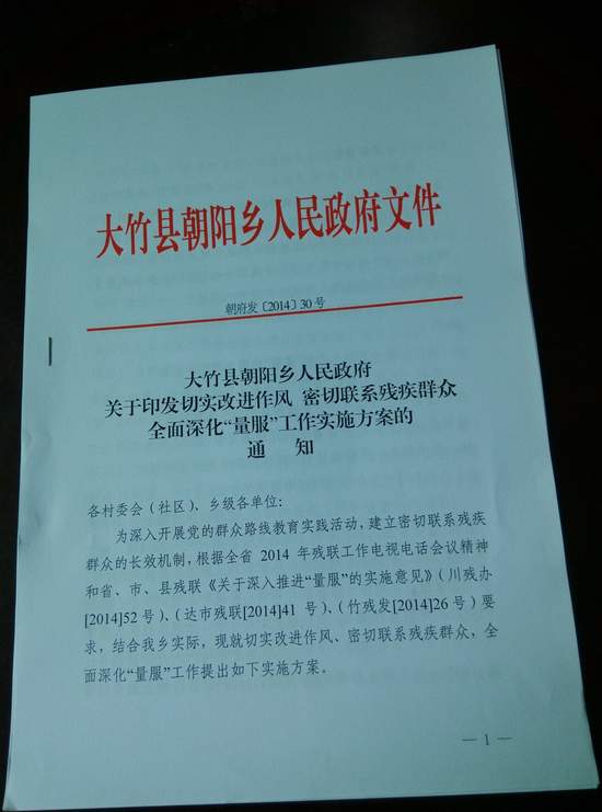 2014年是全省“量服”深化年,朝陽鄉(xiāng)黨委、政府高度重視,5月20日,成立了由鄉(xiāng)長徐東全任組長,副鄉(xiāng)長張保平任副組長,鄉(xiāng)殘聯(lián)理事長李世瓊,鄉(xiāng)殘疾人專職委員李金儒為成員的“量服”工作領(lǐng)導(dǎo)小組,并制定了(朝府發(fā)[2014]30號)大竹縣朝陽鄉(xiāng)人民政府關(guān)于印發(fā)切實改進作風(fēng)密切聯(lián)系殘疾群眾全面深化“量服”工作實施方案的通知。