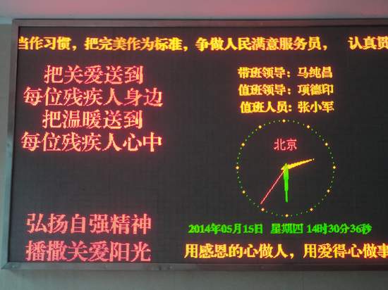 一是鄉(xiāng)黨委、政府召開了關于殘疾人工作面臨的重點和難點研討對策專題會議。通過鄉(xiāng)人民政府電子顯示屏宣傳弘揚關愛、自尊、自強、自立、理解、尊重、關心、幫助殘疾人發(fā)展殘疾人事業(yè)的宣傳口號并滾動播出有關殘疾人自強、自立的影片資料,發(fā)動全民參與扶殘助殘活動。