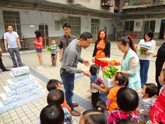 圖為:楊文平副理事長(zhǎng)向聽(tīng)障兒童發(fā)放節(jié)日慰問(wèn)品