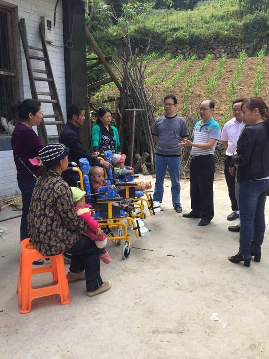 (圖為市人大王霞副主任(右三)帶領(lǐng)相關(guān)部門人員為三個(gè)孩子送去了輪椅)