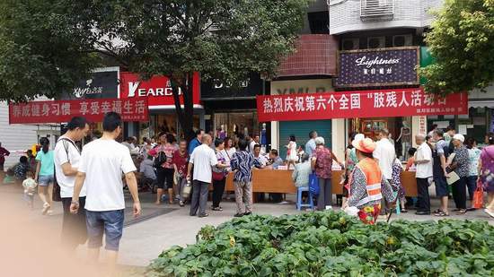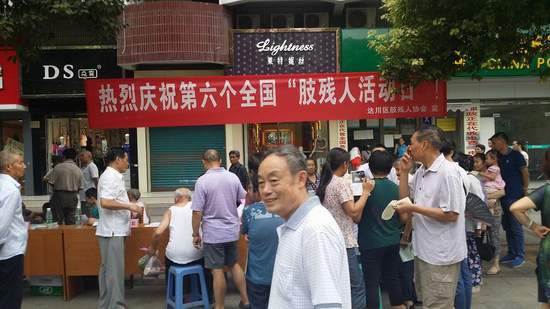 二、開展街頭宣傳活動(dòng)。8月11日上午,區(qū)肢殘協(xié)會(huì)在南外三岔路口搭建宣傳臺(tái),懸掛宣傳標(biāo)語(yǔ),區(qū)殘聯(lián)機(jī)關(guān)各股室、殘疾人就業(yè)服務(wù)所、窗口工作人員、區(qū)殘聯(lián)各專門協(xié)會(huì)主席及委員、翠屏街道辦殘聯(lián)、三里坪街道辦殘聯(lián)及新橋社區(qū)自愿者、區(qū)社會(huì)健身指導(dǎo)員、達(dá)縣和平醫(yī)院、達(dá)州市洪達(dá)頸肩腰腿疼痛?漆t(yī)院醫(yī)務(wù)人員等40余人,開展了一次殘健雙向服務(wù)活動(dòng),慶祝第六次全國(guó)“肢殘人活動(dòng)日”。區(qū)殘聯(lián)黨組書記、理事長(zhǎng)王霞、副理事長(zhǎng)李靜華親臨現(xiàn)場(chǎng)為殘疾人解答疑問。現(xiàn)場(chǎng)義診100余人,指導(dǎo)市民健身200余人,發(fā)放四川省精神親友協(xié)會(huì)編制的《怎樣預(yù)防精神殘疾》宣傳資料、達(dá)川區(qū)殘疾人救助政策、殘疾人證辦理流程、預(yù)防殘疾和殘疾人康復(fù)知識(shí)、殘疾人保障法等宣傳資料共計(jì)4000余份,深受市民青睞,獲得市民好評(píng)。