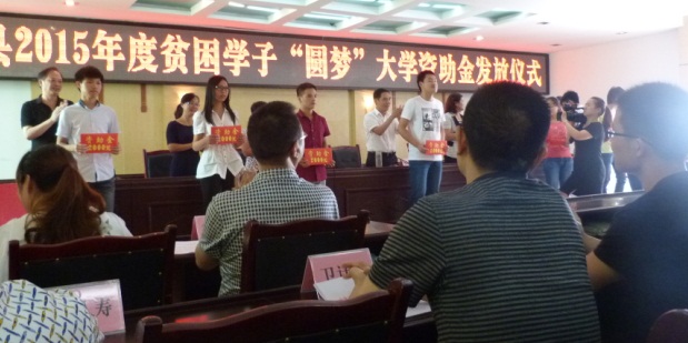 為深入開展2015年度全縣助貧困學(xué)子“圓夢(mèng)”大學(xué)活動(dòng),根據(jù)《中共開江縣委辦公室、開江縣人民政府辦公室關(guān)于對(duì)唐志梅等235名貧困大學(xué)新生給予資助的通知》(開江委辦[2015]140號(hào))文件精神,8月20日下午,由關(guān)工委組織在縣教科局隆重舉行了2015年貧困學(xué)子“圓夢(mèng)”大學(xué)資助金發(fā)放儀式,為我縣今年考入大學(xué)的235名(殘疾人及殘疾人子女26人)寒門學(xué)子發(fā)放資助金,為困難家庭獻(xiàn)上一份溫暖、為莘莘學(xué)子送上一份祝福、為社會(huì)傳遞一份真情。
