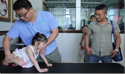 圖片三:市康復(fù)中心的矯形器師對在訓(xùn)腦癱兒童仔細(xì)進(jìn)行矯形器裝配取型。
