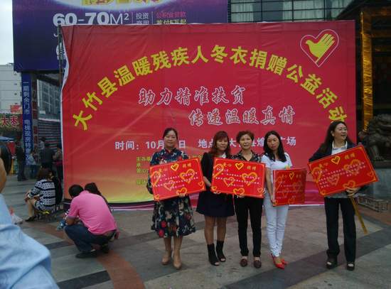 2015年大竹縣各鄉(xiāng)鎮(zhèn)殘聯(lián)在對每位殘疾人的“量體裁衣、個性化服務”工作中了解到農村貧困殘疾人和困難群眾急需解決衣著困難等問題,經各鄉(xiāng)鎮(zhèn)殘疾人專職委員提議,由大竹縣殘疾人聯(lián)合會主辦,大竹縣青年志愿者協(xié)會,大竹縣零距離公益志愿者協(xié)會承辦的“助力精準扶貧 傳遞溫暖真情”溫暖殘疾人冬衣捐贈大型公益活動于10月17日(星期六)在大竹縣煌歌廣場舉行。
