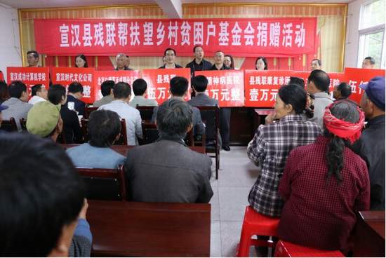 儀式上,縣殘聯(lián)、北京仁愛嘉禾康復(fù)輔具科技有限公司成都分公司、縣殘聯(lián)康復(fù)診所、時代文化公司等7家愛心企業(yè)和幫扶部門現(xiàn)場為望鄉(xiāng)村貧困戶基金會捐款10.3萬元。