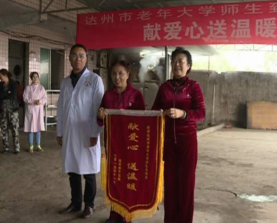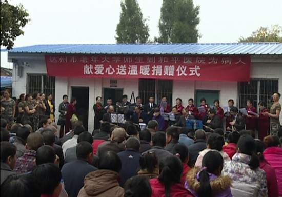 2015年寒冬季節(jié)來臨,達州市老年大學師生和達州市紅楓藝術(shù)劇院愛心人士牽掛著達縣和平醫(yī)院精神病患者的越冬問題。11月5日上午,達州市老年大學和達州市紅楓藝術(shù)劇院20余名志愿者冒著傾盆大雨來到達縣和平醫(yī)院火峰山精神病專科醫(yī)院,為400余名精神病患者送去了價值一萬余元實用的新舊棉衣,鞋子,襪子等御寒物資2000余件,還為這里的病人和醫(yī)護人員帶來了一臺精彩的文藝節(jié)目。