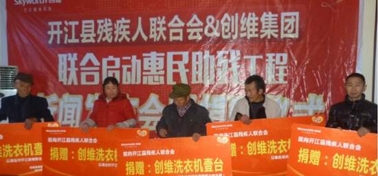 捐資助貧、扶危助困是中華民族的傳統(tǒng)美德,11月30日上午,我會隆重舉行了“創(chuàng)維公益萬里行”開江縣惠民助殘工程啟動儀式。本次創(chuàng)維集團(tuán)向我縣殘疾人了捐贈5臺32吋電視機(jī)和5臺全自動洗衣機(jī)。同時將向開江縣殘疾人朋友發(fā)放12000份面值500元的惠民補(bǔ)貼卡,總計價值600萬。