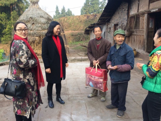 圖8:通川區(qū)委常委、總工會主席劉江(右一)、副區(qū)長羅琳(左一)慰問北山鎮(zhèn)貧困殘疾人艾有貴