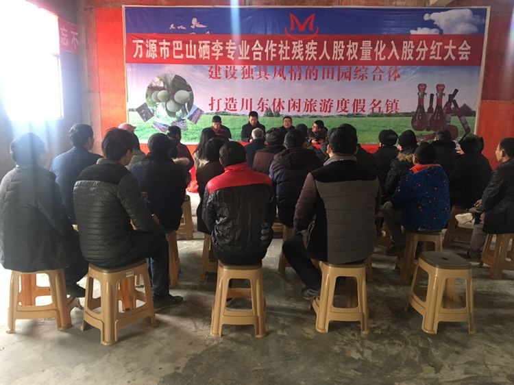 2月1日,萬源市巴山硒李專業(yè)合作社殘疾人入股分紅大會在魏家鎮(zhèn)召開。萬源市殘聯(lián)、魏家鎮(zhèn)人民政府領(lǐng)導(dǎo)及相關(guān)工作人員參加了分紅大會,現(xiàn)場為來自該鎮(zhèn)石壩村、小坪子村、擋山村的34戶建檔立卡貧困殘疾人發(fā)放了股權(quán)證,兌現(xiàn)了每戶300元的股權(quán)量化分紅款。殘疾人紛紛表示:“不投一分錢,也不用投入勞力,卻能入股分紅啦!黨的政策真是太好了!”
