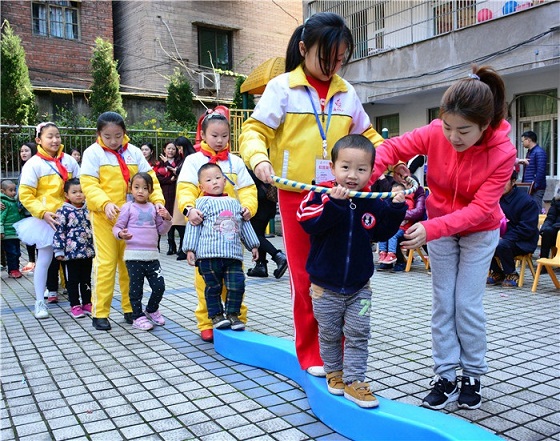 互動(dòng)游戲環(huán)節(jié),首先進(jìn)行的是連體人游戲,一名小記者加一名聽障兒童,用呼啦圈將兩人圈在一起,然后走過(guò)平衡木;顒(dòng)開始了,弟弟妹妹走在前面,小記者走在后面,小心翼翼地呵護(hù)。接下來(lái)舉行了袋鼠運(yùn)球游戲,由小記者先跳到弟弟妹妹旁邊,然后牽著弟弟妹妹到籃球框,將手中的球投進(jìn)籃框算完成游戲。既要照顧好弟弟妹妹,又要進(jìn)行袋鼠跳,雖然大家都出了一身汗,但每個(gè)人都十分開心。