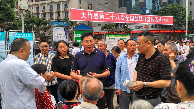 為迎接第二十八次“全國(guó)助殘日”的到來(lái),5月18日上午,大竹縣在煌歌廣場(chǎng)舉辦了以“全面建成小康社會(huì),殘疾人一個(gè)也不能少”為主題的助殘日大型廣場(chǎng)宣傳活動(dòng)。大竹縣殘工委成員單位及縣醫(yī)院、中醫(yī)院、保健院、博愛醫(yī)院、康仁醫(yī)院等5家醫(yī)院參加了本次活動(dòng)?h委常委、總工會(huì)主席鄭河川,縣殘聯(lián)黨組書記、理事長(zhǎng)徐博彬等領(lǐng)導(dǎo)親臨活動(dòng)現(xiàn)場(chǎng)。