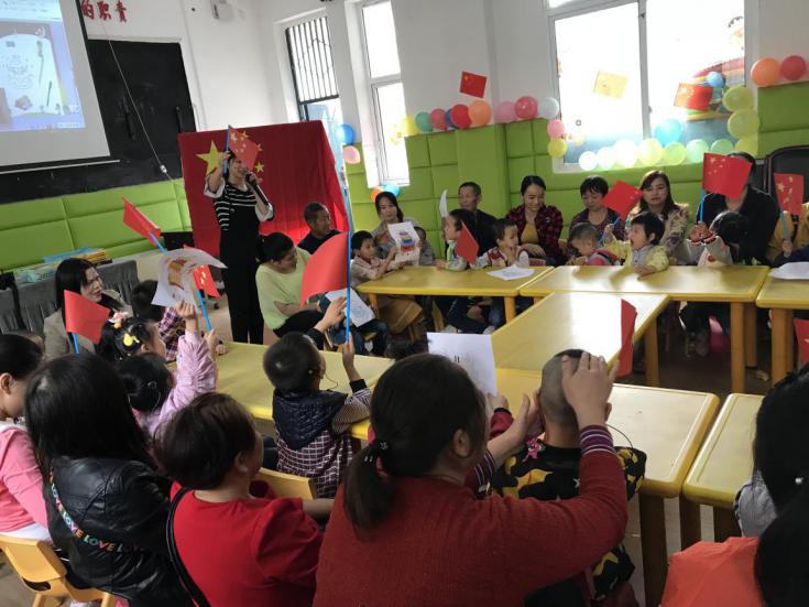 圖1:孩子們正認(rèn)真地聽著老師講解國慶節(jié)、國旗、國歌。