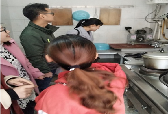 圖二:家委會成員對廚房操作間進行衛(wèi)生檢查