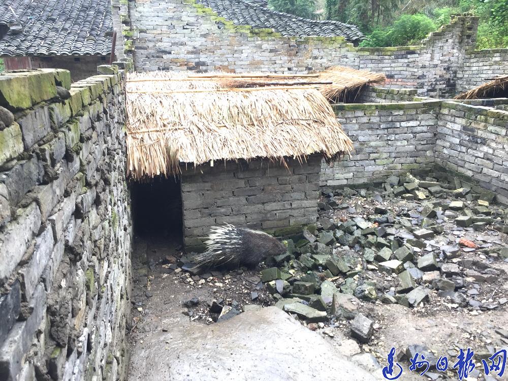 快速吃完母親煮的面條,劉后浪拿起長(zhǎng)掃帚開始打掃豪豬圈舍。豪豬圈舍是鄰居遺棄了的舊房子,原本搖搖欲墜,是劉后浪爬上爬下將其加固。打掃時(shí),劉后浪除了要忍受難聞的氣味,還得注意豪豬身上的棘刺。圈舍收拾完,劉后浪又來到附近的一片草地,割了一捆野草當(dāng)飼料。
