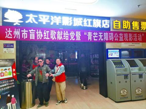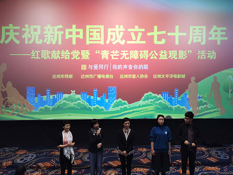 活動當(dāng)天早上7點半,120名盲人代表和親屬及10余名“紅十字會”志愿者。陸續(xù)來到太平洋電影城。8點40分,10位“觀影”的盲人朋友首先唱起了《紅旗飄飄》《黨啊親愛的媽媽》等紅歌,代表所有盲人朋友表達(dá)了對祖國母親的美好祝愿,展示出我市殘疾人朋友積極向上、熱愛生活感恩黨奮進的精神風(fēng)貌。隨后,電影《我和我的祖國》開始放映。通過成都市和達(dá)州市電視臺6位主持人對故事背景、場景和人物動作的精彩解說,給現(xiàn)場的盲人朋友帶來了一場與眾不同的“聽覺”盛宴,引導(dǎo)盲人朋友聽黨話、感黨恩、跟黨走。在觀影的過程中,來自達(dá)川區(qū)的盲人吳女士還通過微信語音,把現(xiàn)場的聲音發(fā)給一位腦癱朋友。吳女士說,這位朋友因為肢體殘疾不能出門,只能通過這種方式和她分享這個時刻。“我第一次這樣‘看’電影,簡直太過癮了。”吳女士接著說,這次“觀影”不同于以往的聽音頻,主持人們對故事場景、情節(jié)和人物之間互動的詳細(xì)描述,讓他們能更好地想象電影畫面。