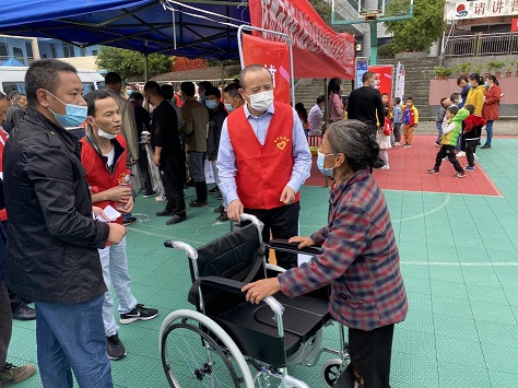 (圖為管村鎮(zhèn)活動(dòng)現(xiàn)場(chǎng),林理事長(zhǎng)向殘疾人發(fā)放輪椅并親切交談)