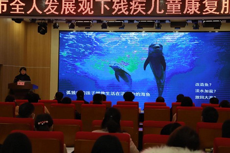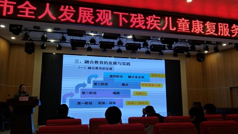 (圖4為都江堰市特殊教育資源中心副主任鄭萍講解全人發(fā)展觀下的融合教育支持體系及隨班就讀策略)