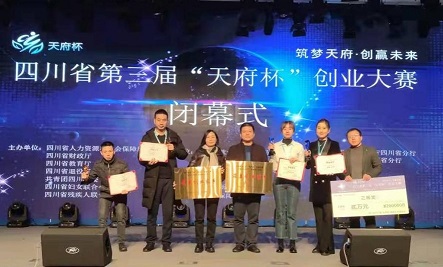 劉后浪(左一)在四川省第三屆“天府杯”創(chuàng)業(yè)大賽頒獎(jiǎng)臺(tái)上