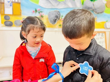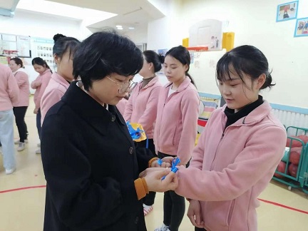 圖六:睿思跨世紀(jì)幼兒園為教師系上藍(lán)絲帶
