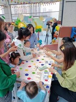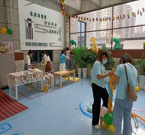 活動(dòng)中,全體教職員工和部分家長(zhǎng)一起布置游戲、美食、購物一條街的情景場(chǎng)地,家委會(huì)成員到超市購買物品,洗、切、串、煮、蒸分工明確,熱鬧非凡,有條不紊地為親子游園教學(xué)活動(dòng)精心準(zhǔn)備。轉(zhuǎn)動(dòng)的風(fēng)車、繽紛的氣球、扮演店主和服務(wù)員、動(dòng)感的音樂,節(jié)日的氣氛滲透在中心的每一個(gè)角落。