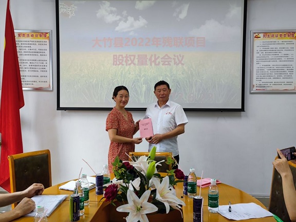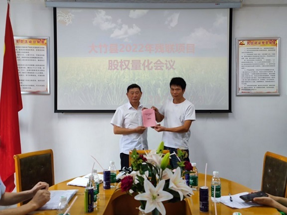 為持續(xù)推進股權量化工作,鞏固脫貧攻堅成果與鄉(xiāng)村振興的有效銜接,確保脫貧殘疾人穩(wěn)定增收不返貧,6月24日,大竹縣殘聯(lián)在月華鎮(zhèn)四川東柳醪糟有限責任公司召開大竹縣2022年殘聯(lián)項目股權量化工作會議,為月華鎮(zhèn)29名殘疾人發(fā)放股權證書。