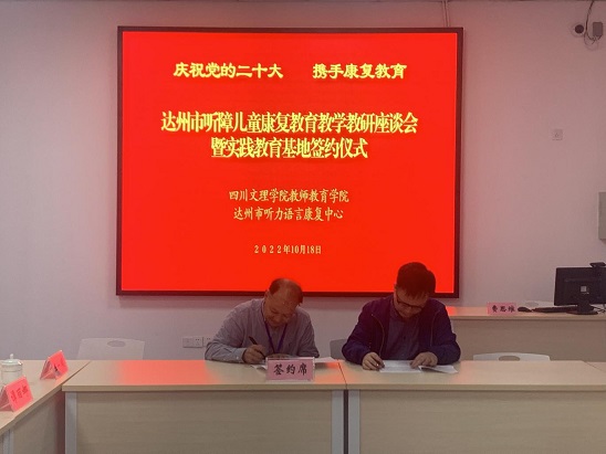 交流座談會(huì)上,達(dá)州市殘聯(lián)黨組成員、副理事長(zhǎng)唐琳彬同志用“牽手”、“同行”、“雙飛”寓意深刻的六個(gè)字對(duì)本次簽約和簽約儀式作了講話:首先是深度了解后的“牽手”。四川文理學(xué)院特殊教育專(zhuān)業(yè)從2011年開(kāi)始向達(dá)州市聽(tīng)力語(yǔ)言康復(fù)中心派送大學(xué)生實(shí)習(xí)已經(jīng)11年,11年漫長(zhǎng)期待,11年相互支持,今天終于正式簽約“牽手”,四川文理學(xué)院特殊教育專(zhuān)業(yè)能夠充分利用達(dá)州市聽(tīng)力語(yǔ)言康復(fù)中心在人才培養(yǎng)、場(chǎng)地建設(shè)、設(shè)備配置、項(xiàng)目管理、康復(fù)實(shí)踐等方面豐富的康復(fù)教育資源,開(kāi)展聽(tīng)障兒童康復(fù)教學(xué)教研及學(xué)術(shù)研究。“牽手”雙方要認(rèn)真抓住這次機(jī)會(huì)深度合作,進(jìn)一步彌補(bǔ)達(dá)州市聽(tīng)障兒童康復(fù)教育經(jīng)驗(yàn)總結(jié)提煉不夠、切合達(dá)州實(shí)際的聽(tīng)障兒童康復(fù)教育科研課題空白等短板。其次就是攜手并肩“同行”。如何同行?市聽(tīng)力語(yǔ)言康復(fù)中心的部門(mén)負(fù)責(zé)人和教師等要認(rèn)真思考如何與四川文理學(xué)院特殊教育專(zhuān)業(yè)達(dá)到深度的契合,迎頭趕上四川文理學(xué)院特殊教育專(zhuān)業(yè)改革與發(fā)展的步伐,攜手并肩助力聽(tīng)障兒童康復(fù)教育研究與實(shí)踐的創(chuàng)新與發(fā)展,竭盡所能為四川文理學(xué)院特殊教育專(zhuān)業(yè)在人才培養(yǎng)、課程教學(xué)、社會(huì)服務(wù)等方面提供有力支持,實(shí)現(xiàn)雙方合作共贏,共同助推達(dá)州的聽(tīng)障兒童康復(fù)教育高質(zhì)量的發(fā)展。再就是實(shí)現(xiàn)“雙飛”。達(dá)州市聽(tīng)力語(yǔ)言康復(fù)中心正在爭(zhēng)創(chuàng)川東北聽(tīng)力語(yǔ)言康復(fù)示范中心,這正是一個(gè)絕佳的發(fā)展機(jī)遇、更是發(fā)展動(dòng)力,要依靠四川文理學(xué)院特殊教育專(zhuān)業(yè)在人才培養(yǎng)、科學(xué)研究等方面的有力資源,助推我們的康復(fù)教育工作持續(xù)推進(jìn),四川文理學(xué)院特殊教育專(zhuān)業(yè)與語(yǔ)康中心在課題研究、行動(dòng)研究等方面加強(qiáng)溝通合作,市殘聯(lián)將會(huì)從政策、資源等方面助力雙方“比翼雙飛”。