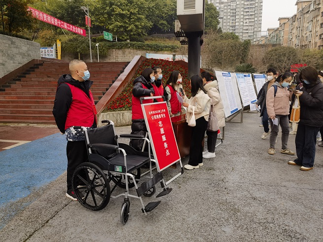 本次公招共有14910名考生報(bào)名參考,其中殘疾考生57名,報(bào)考通川區(qū)殘聯(lián)、萬(wàn)源市白果鎮(zhèn)鄉(xiāng)鎮(zhèn)、宣漢縣胡家鎮(zhèn)、渠縣天星街道4個(gè)職位工作人員。為更好的服務(wù)殘疾人考生,考務(wù)部門從機(jī)關(guān)、社會(huì)單位組織了25名志愿者到場(chǎng)為殘疾考生服務(wù),并準(zhǔn)備了口罩、鉛筆、輪椅等備用。早上8點(diǎn)30分,各考點(diǎn)考生開始入場(chǎng),志愿者早已做好準(zhǔn)備,為考生提供口罩、鉛筆,指引考場(chǎng),遇有不方便的殘疾考生,及時(shí)提供服務(wù),幫助考生順利參考。
