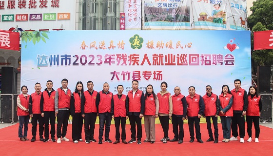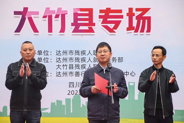 (圖為大竹縣委常委、統(tǒng)戰(zhàn)部部長、總工會主席龐啟來(中)在達州市2023年殘疾人就業(yè)巡回招聘會上致辭)