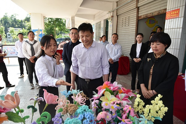 (圖二:王健一行參觀達川區(qū)特殊教育學校學生手工藝制品)