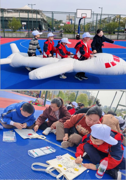 活動伊始,家長陪伴孩子們陸續(xù)抵達運動公園,自行帶領(lǐng)學生認識公園里的植物,幫助學生識記。隨后,體智能老師帶領(lǐng)大家做熱身運動。在親子游戲環(huán)節(jié),開展模擬開飛機、坦克帶行走、球球大作戰(zhàn)等豐富多樣的游戲;在親子創(chuàng)作環(huán)節(jié),家長和孩子共同為帆布包上色,讓孩子與家長密切配合,增進了親子感情,鍛煉了孩子們的協(xié)作能力和創(chuàng)造能力,現(xiàn)場歡笑不斷。